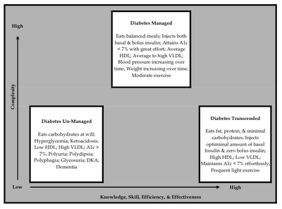 The y-axis, complexity, relates to the treatment—medication & nutrition—and lifestyle a person implements or recommends.  Regarding the x-axis, knowledge, skill, efficiency, and effectiveness, it could be looked at from two perspectives; one, from a diabetic’s perspective, where the focus is on their knowledge & skill as it relates to implementing advice from a third-party or self-directed behavior, and another, from the perspective of a third-party’s knowledge & skill, be it friend, relative, caregiver, nutritionist, nurse, or doctor.  Treatment efficiency and effectiveness in either case is also measured.